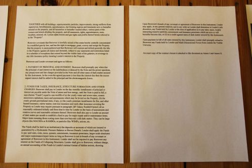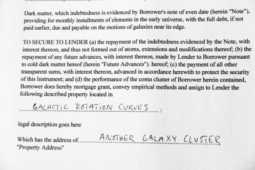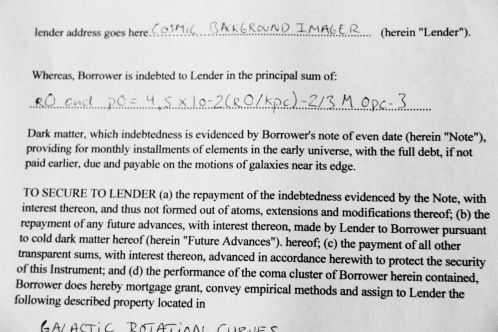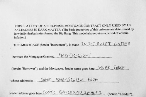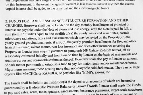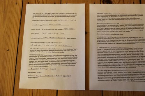 'Sub-prime Mortgage Contract, Lenders of Dark Matter' is a text piece that consist of a mortgage contract where you borrow dark matter instead of money.