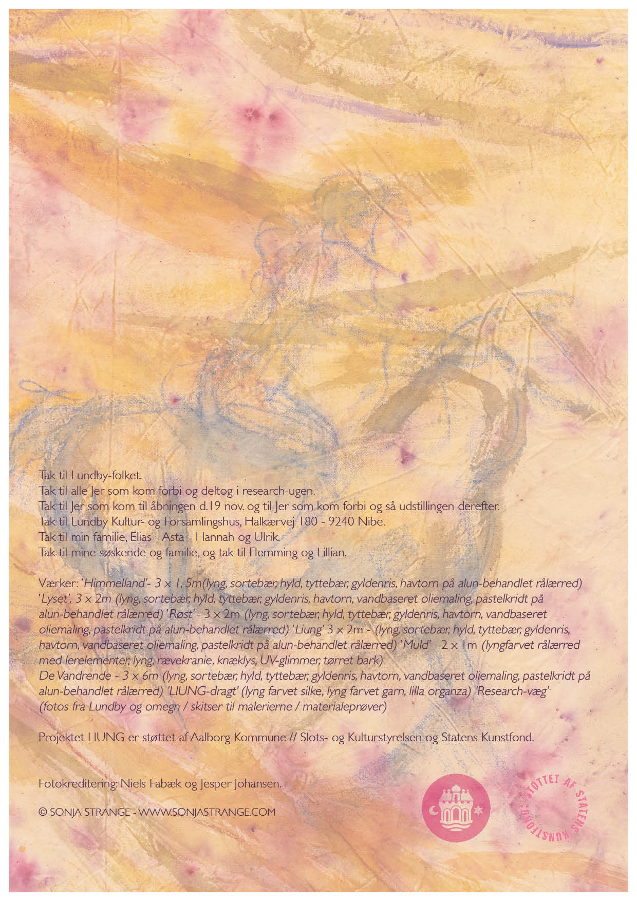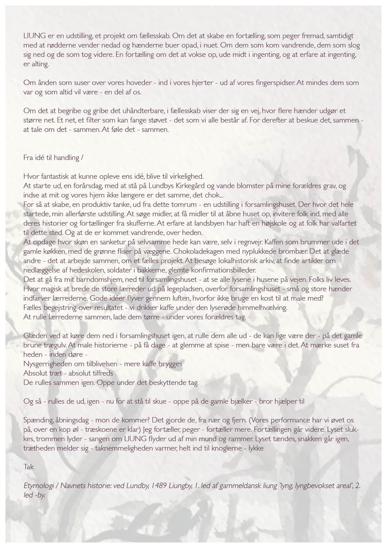 LIUNG er en udstilling, et projekt om fællesskab. Om det at skabe en fortælling, som peger frem ad, samtidigt med at rødderne vender nedad og hænderne buer opad, i nuet. Om dem som kom vandrende, dem som slog sig ned og de som tog videre. En fortælling om det at vokse op, ude midt i ingenting, og at erfare at ingenting, er alting.